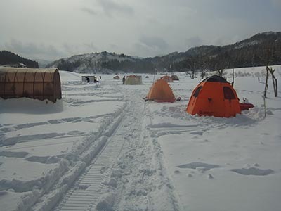 ワカサギ釣り わずか2年目とは思えない盛況ぶり! テントが20張り以上ならんでいます。 昨年は突然お客さんが入って、何の準備もしてなかったので 駐車違反やら道路除雪のトラブルやらいろいろありました。 今年は20台分の駐車場を確保できたのでノントラブル! 要一が毎日除雪にいそしんでおります。 もう一回言います。 要一が毎日除雪にいそしんでおります! 今日のひとこと 小国わかさぎ会のホームページもご覧ください。 渡部要一の米のホームページもご覧ください。 |