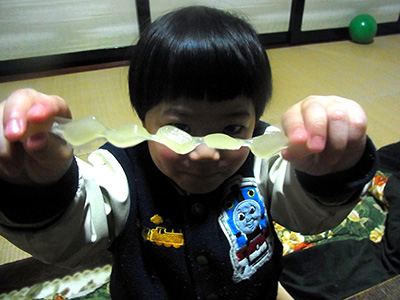 のグミを買ってきました。 かっぱ寿司もビックリの60円! 子供たち、さっそく開封。 父「ごはんの上にマグロをのせてみたら?」 子「ごはんなんて、ないよ。桃のグミだよ。」 ・・・ん?「ごっご遊び」を理解してない? 父「この赤いのは?」 子「マグロ!」 父「この黄色いのは?」 子「タマゴ焼き!」 父「じゃあ、この白いのは?」 子「・・・桃のグミ!」 父「ごはんでしょ」 子「グミだよ・・・」 父「じゃあ、このオレンジ色のは?」 子「イクラ!」 う~ん、さすが農家の孫。 どうしても米だけは妥協できないらしい。 でも、のせて食べてました。 ところでイクラのにぎりって、何・・・ 下の子は、寿司ごっごなど眼中外! 桃グミとぶどうグミに猛チャージです。 何のこだわりもなく、モリモリ食べてました。 今日のひとこと イクラのにぎり、食ってみたい。 渡部要一の米のホームページもご覧ください。