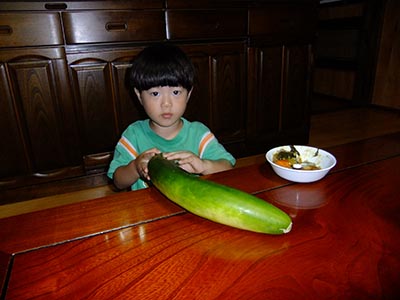 子供たちが、保育園でとれたきゅうりを持ってきました。