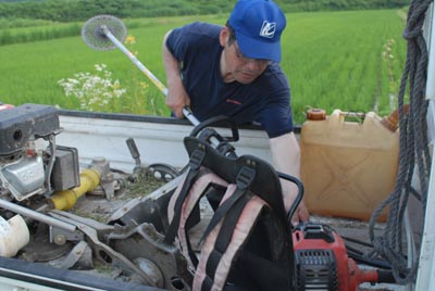 小国も高温多湿の日々が続き、畦(あぜ)の雑草がわっさわっさ! というわけで、クサカリスト(草刈りist)参上!! 見てください、この仕事っぷり! 三菱製33ccエンジンが唸りをあげて、 背丈ほどもある畦の雑草をばっさりと 刈り倒していきます。 というか、背丈まで放置するのもどうかと・・・。 次の田んぼでエンジン始動! ・・・え? ピクリともしません。 手ごたえも皆無・・・。 なんで? あ・・・ エンジンスターターの紐が・・・ 紐が・・・ 切れてる~!!! スターターの紐はただのナイロン製。 こんなことは田んぼでは日常茶飯事。 そういうわけで、クサカリスト撤収! 今日のひとこと ラッキー7、何をかいわんや。(ラッキー7についてはここを参照) 渡部要一の米のホームページもご覧ください。 PR