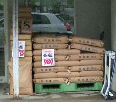 スーパーで買いますか? どのくらい買いますか? 小瓶ですか? 500g袋ですか? ブランドは選んでますか? 博多ですか?赤穂ですか? 小国では「塩事業センター」ブランドの 20kgか25kgが主流です! ほら。 スーパーの軒先で大量に売ってます。 実はこれ、山菜の塩漬け用なんです。 先日遠方から来た人が、これを見て驚き、 「ナニコレに出せるよ!」と騒いでました。 買い方もちょっとかわっています。 レジで数量を自己申告して清算したあと、 用意してある台車(右端)をサッと出して 何の迷いもなく積み出せばOK。 この塩の前に軽トラックを横づけして、 いきなり3袋くらい勝手に積み込んで、 おもむろにレジに行き「3つ」とつぶやくのが 最高にツウな買い方です。 袋を立ててシルバーカーに無理やりのせ、 袋の腰が若干おれた状態でレジまで押して 持ち込むのも小粋です。 「山菜王国」小国ならではの光景なんですね。 気づきませんでした。 今日のひとこと 「並3つ」で通じます。 渡部要一の米のホームページもご覧ください。