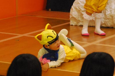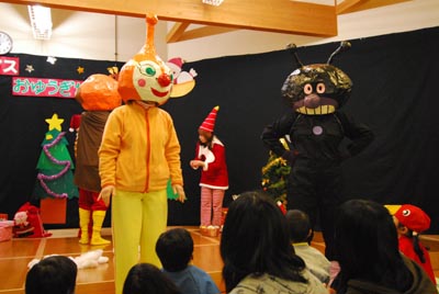 かなり大きくなったので土から鉢に移し替えるのは不可能かと思われましたが、爺・要一が孫のためにと掘り起こしてくれたので、やむを得ず玄関に上げます。 ・・・が、重い。重すぎる。どう考えたって50キロ超。 しかも枝が目に刺さって、めちゃくちゃ持ちにくい・・・。 30分かけて運び込み、飾りつけも無事終了。 この違和感!!!! ツリーというより盆栽です。 「クリスマス盆栽」 良い枝ぶりです。 2歳児も大喜び! 「うわぁ~、人だぁ~!」 ・・・喜び方が違います。 ちなみに彼はこの人を 「クリスマさん」と呼びます。 大体あってます。 今日のひとこと 本物は手あます。来年、どうしよう・・・ 渡部要一の米のホームページもご覧ください。 クリスマスおゆうぎ会がありました。 右から2番目が長男です。 ボンボンで見えません・・・ ←マイペースに、舞台の上で 寝っころがって遊んでます・・・おいおい 見に来た人も「大物だねぇ」・・・冷汗 アンパンマンです。 バイキンマンの中がお母さんです。 なかなかがんばっておりました。 今日のひとこと 手に汗握るクリスマス会。 渡部要一の米のホームページもご覧ください。