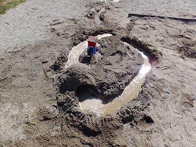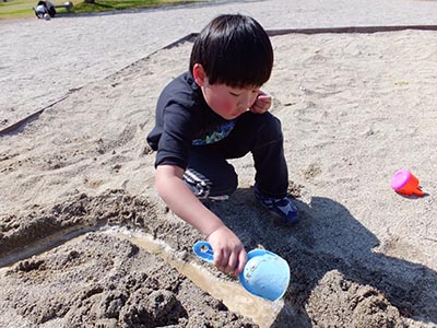 結構はまります。 上の子に「なに作ってんの?」と聞いたら 「コップ!」 ああ、なるほど。 サマになってます。 というか、うまい? と思いながら見ていたら、 「よし!できた!」と言うなり、突然クラッシュ! 「じゃ~、次はねぇ、皿をつくろう!」 陶芸の意味を理解していないらしいです。 結局、エンドレスに作品を「練り」続けました。 下の子は先生に作ってもらいました。 先生「なに作りたい?」 下の子「メガネ!」 で、先生、メチャクチャがんばってくれました。 ご難儀をおかけいたしました。 がんばる先生を横で、超マイペースな下の子。 「できた!ミッキーマウス!」 ん~、ミッキーね。 今日のひとこと インスピレーションと天才とは一心同体である。 byユーゴー 渡部要一の米のホームページもご覧ください。 半年ぶりの本格的な砂遊びです。 現場は今回もドリームランド。 わざわざ1時間かけて砂遊びしに行ってます。 本日の完成写真。 本気です。 今日のひとこと 工期2時間。結構な難工事だったようです。 渡部要一の米のホームページもご覧ください。 |