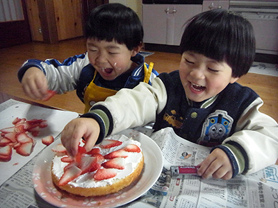 恒例の「お兄ちゃんの手作りケーキ」でお祝いです。 今年は本人もお手伝い。 ・・・お手伝い? 何はともあれ、めでたく完成! で、ハッピーバースデーを歌って、 ろうそくを消して、 またろうそくをつけて、消して、 さらにつけて、消して。 ろうそくが半分までなくなりました。 今日のひとこと 来年も使おうと思ってたのに・・・ 渡部要一の米のホームページもご覧ください。 |