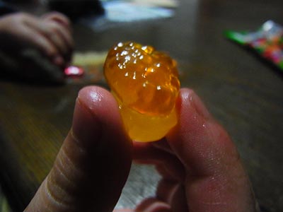 のグミを買ってきました。 かっぱ寿司もビックリの60円! 子供たち、さっそく開封。 父「ごはんの上にマグロをのせてみたら?」 子「ごはんなんて、ないよ。桃のグミだよ。」 ・・・ん?「ごっご遊び」を理解してない? 父「この赤いのは?」 子「マグロ!」 父「この黄色いのは?」 子「タマゴ焼き!」 父「じゃあ、この白いのは?」 子「・・・桃のグミ!」 父「ごはんでしょ」 子「グミだよ・・・」 父「じゃあ、このオレンジ色のは?」 子「イクラ!」 う~ん、さすが農家の孫。 どうしても米だけは妥協できないらしい。 でも、のせて食べてました。 ところでイクラのにぎりって、何・・・ 下の子は、寿司ごっごなど眼中外! 桃グミとぶどうグミに猛チャージです。 何のこだわりもなく、モリモリ食べてました。 今日のひとこと イクラのにぎり、食ってみたい。 渡部要一の米のホームページもご覧ください。
