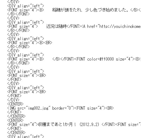 ついに更新しました。 田植え後1週間から、一気に収穫ひと月前です。 実は、昨年から不調気味だったパソコンが壊れて、 新調したのですが、ホームページソフトが古すぎて 使えない事態に陥っておりました。 さらに使っていたソフトも絶版で、新しいものでは 現在のホームページを読み込めないとのこと。 そこでこのたび、ついに、タグ打ちにて更新する 決意をいたしました。原始的! タグ打ちって、わかります? ↑こういう状態ですよ。 画像や文字を「HTML」という言葉で指定する方法です。 久しぶりにやりましたが、けっこう燃えます。 これからしばらく、コレでいきます。 今日のひとこと 計画的な更新って、大切なんですね。 渡部要一の米のホームページもご覧ください。
