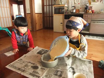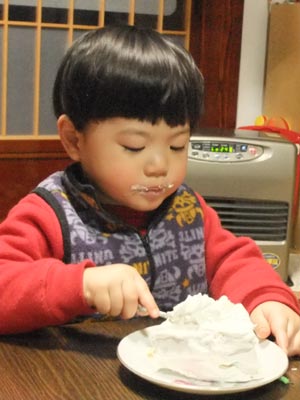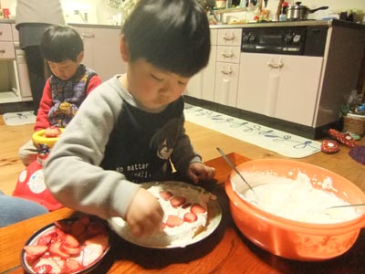 2歳になりました。 さっそくお兄ちゃんがケーキを作ってくれます。 こぼさず混ぜ混ぜ。意外とうまい。 弟も心配そうに見守ります。 オーブンに入れて・・・ 待つこと30分。 アンパンマン×2話で焼き上がり。 できたスポンジケーキに生クリームと イチゴをデコレーション! で、完成~! ほら、結構上手でしょ。 弟、大喜び! 今日のひとこと 楽しくて何より。 渡部要一の米のホームページもご覧ください。 |