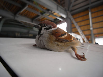 ボンネットに何かいる! 近づいてみたら・・・ スズメ! しかも異常な落ち着きぶり。 全然逃げる気ナシ! とりあえずエンジンをかけたら、 飛んでいきました。 休んでるところ、悪いことしたなぁ。 今日のひとこと ツバメだったら、「ボンネットに座ろう(swallow)」とか言えたのに。 渡部要一の米のホームページもご覧ください。 |
