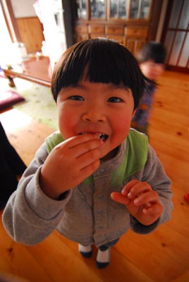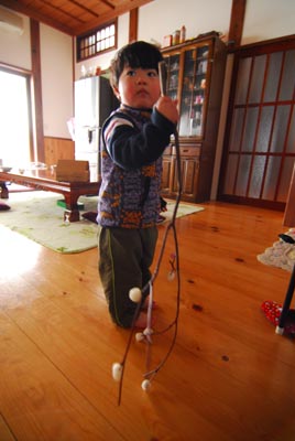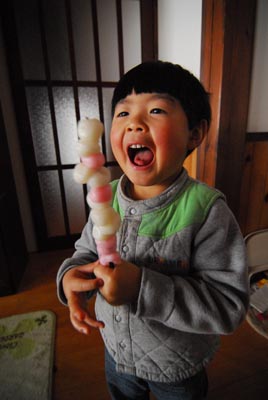 ミズキの枝を団子や縁起物で飾り、 五穀豊穣を祈る小正月行事です。 まずは紅白の団子を枝に刺します。 最近は硬くならない砂糖入りの団子が スーパーなどで販売されています。 続いて鯛や大黒様などの飾りを下げます。 上の子は鯛を金魚、大黒様をゴリラと呼びます。 3歳児にはまだまだ理解しがたい世界のようです。 こんな感じで無事完成です。 ※本来はもっと大きいです。 と、ここで下の子が、別のところに飾るためにつくっていた団子つきの枝を持って逃走! 上の子もそこから団子をむしり取って パクっ!パクっ! さらに、余った団子を・・・ 箸に串刺しにして超ロング団子! 亀田三兄弟やウルトラ八兄弟を凌駕し、 あのビッグダディにせまるだんご13兄弟! ・・・やりたい放題です。 そんなわけで、完成まで例年の倍の時間を要し、 サイズも大幅に縮小せざるを得ませんでした。 今日のひとこと 今年は15日が休みで良かった 渡部要一の米のホームページもご覧ください。