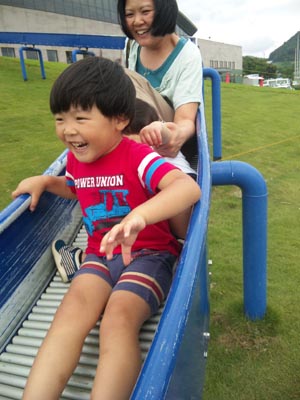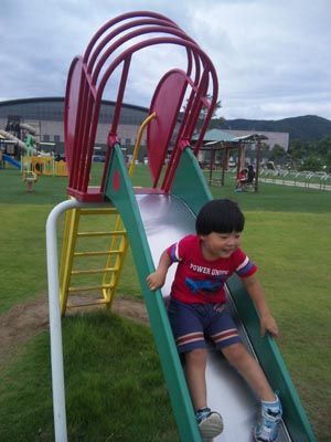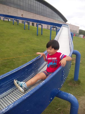 上の子は早速ローラーコースターを発見! お母さんと下の子と一緒にすべります。 下の子、靴と手だけ見えてます。 お父さんも乗ってみたのですが、 台の幅が足りず断念。ケツイタイ・・・ 再び上の子一人で。 この間、お父さんはスタートとゴールの間を 全力で走り続けます。シンドイ・・・ そしてさらに別の滑り台でも。 滑り台三昧の一日でした。 今日のひとこと 「すれびだい」じゃなくて「すべりだい」ね。わかった? 渡部要一の米のホームページもご覧ください。
