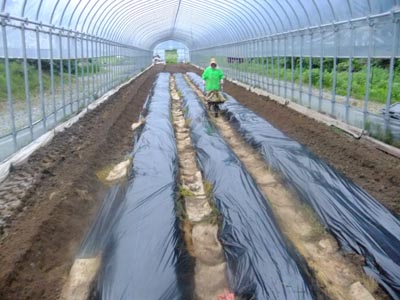いやぁ、結局ですねぇ、 植えないうちに実が大きくなってしまって、 ポット苗のままとらざるを得なくなったんです。 前代未聞のポット苗菜園! そこで、ばあちゃん、がんばりました! ついに定植準備完了。 先日の大雨でドロドロになっていた ビニールハウスの土も回復。 これでナスもこころおきなく実れます。 今日のひとこと おおきくなれよ。もうなってるけど。 渡部要一の米のホームページもご覧ください。 |
