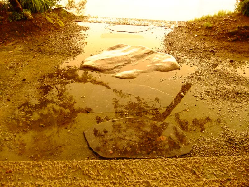 突然太陽が顔を出し、すごい夕焼け。 庭先の飛び石が、本当に飛ばないと 渡れないくらい水没しています。 裏山には大きな虹。 珍しい天気でした。 今日のひとこと 写真とりにくい。 渡部要一の米のホームページもご覧ください。