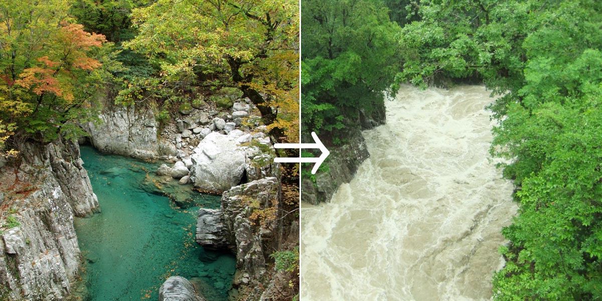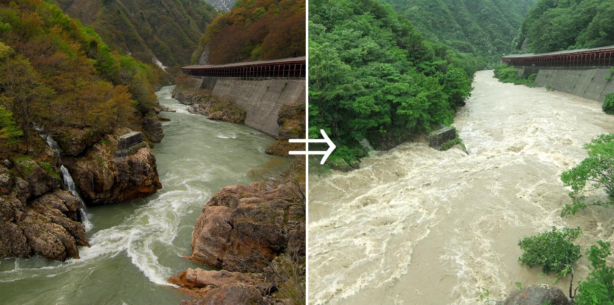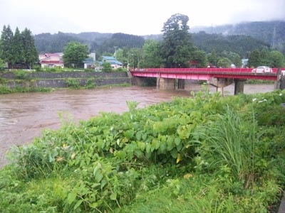 確かに、そのくらいすごい雨でした。 先日の写真ではイマイチすごさが見えないので、 普段の様子と比較した写真を作ってみました。 まずは飯豊山のすぐふもとのあたり。 いつもはエメラルドグリーンの川面が とてもきれいな人気スポット「天狗橋」。 今回、水位が10m近く高くなりました。 続いて町の中心部から約2kmの赤芝峡。 こちらも7~10mの増水です。 地響きのようなうなりが聞こえました。 でも、よく観察すると、どちらの写真の場所も 今回の増水位まで壁の岩肌が白くなっています。 つまり、ここまでの増水はよくあることなんですね。 改めて自然の驚異を感じました。 ところで、端午の節句以来回収不能になっていた 吹流しのことを覚えていますか?これです。 今回の風雨によって枝ごと折れて落ちてきて、 庭先でのたうちまわっていました。 かなり長い期間にわたって 枝にコブラツイストしていたので 若干の傷はありますが、 とりあえず健全です。 鯉のぼりから50日遅れで 箱に収納されました。 きょうのひとこと 忘れた頃にやってくる。 天災も、吹流しネタも。 渡部要一の米のホームページもご覧ください。