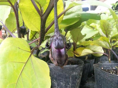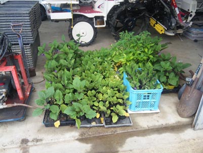 この日、初ナスが実りました。 まずいです。 何がまずいって・・・ まだこの状態で、植えてないのに ポット苗に実がついちゃったんです。 早く植えないと・・・ 今日のひとこと 大丈夫。接木苗は強いから・・・ 渡部要一の米のホームページもご覧ください。