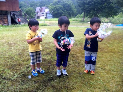 今日はシャボン玉遊び。 プラスチックコップの上にネットを張って、 横からストローをさせば泡泡カップの完成! ネットにシャボン液をつけて、ストローをふくと 泡がモコモコとできます。子供たち大喜び! ちなみにこれで園児全員! ここに先生が2人つきます。 贅沢ですね。田舎の特権です。 今日のひとこと 「今日は泡泡カップを作ります」といわれた瞬間、 YEBISU様が脳裏を全力疾走していきました。 渡部要一の米のホームページもご覧ください。